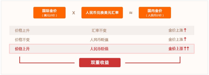 由于国际金价资产以美元计价,当国际金价上涨,同时人民币兑换美元汇率面临贬值风险时,投资黄金可以获得双重收益。